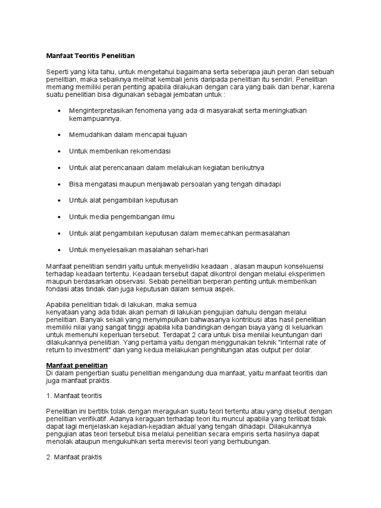 Doc 3 Tujuan Penelitian Rambe Rahman Academia Edu from 0.academia-photos.com Aug 11, 2020 · pengertian manfaat praktis. Jun 22, 2019 · manfaat penelitian di dalam pengertian suatu penelitian mengandung dua manfaat yaitu manfaat teoritis dan juga manfaat praktis. Bagaimana untuk meningkatkan manfaat penelitian melalui penelitian? Manfaat penelitian ini erat hubungannya dengan tujuan penelitianoleh karenannya hampir setiap karya tulis baik skripsi makalah karya ilmiah proposal penelitian dan lain sebaginya selalu menyertakannya. Bagaimana untuk mendapatkan manfaat teoritis? Di dalam penulisan karya tulis berupa penelitian contohnya skripsi terdapat komponen yang wajib ada yaitu manfaat penelitian. Adapun manfaat penelitian ini adalah sebagai berikut : Sep 18, 2018 · manfaat penelitian di dalam pengertian suatu penelitian mengandung dua manfaat yaitu manfaat teoritis dan juga manfaat praktis.